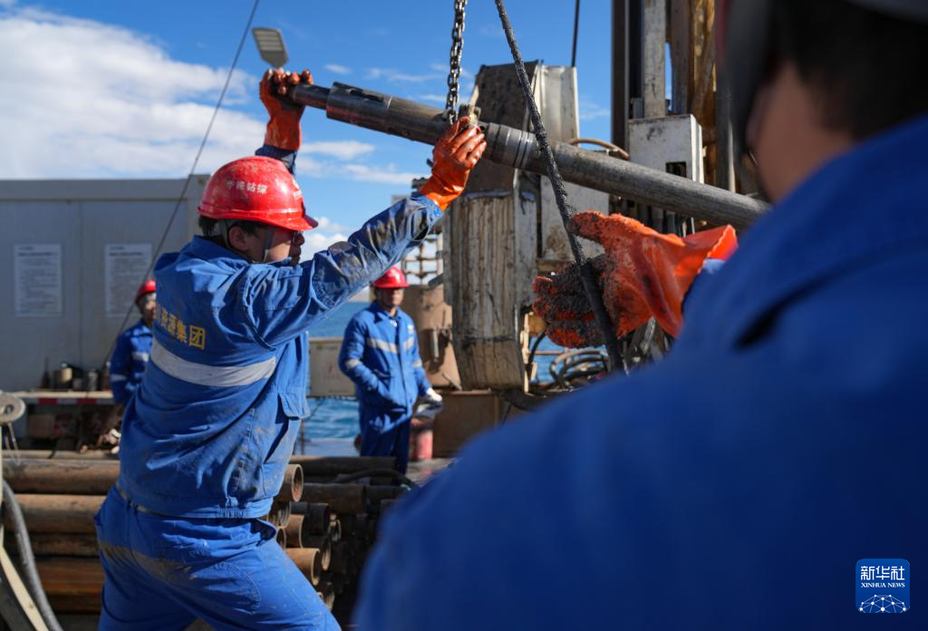 7月11日,鉆探人員提起內管,準備提取湖泊巖芯。新華社記者 晉美多吉 攝