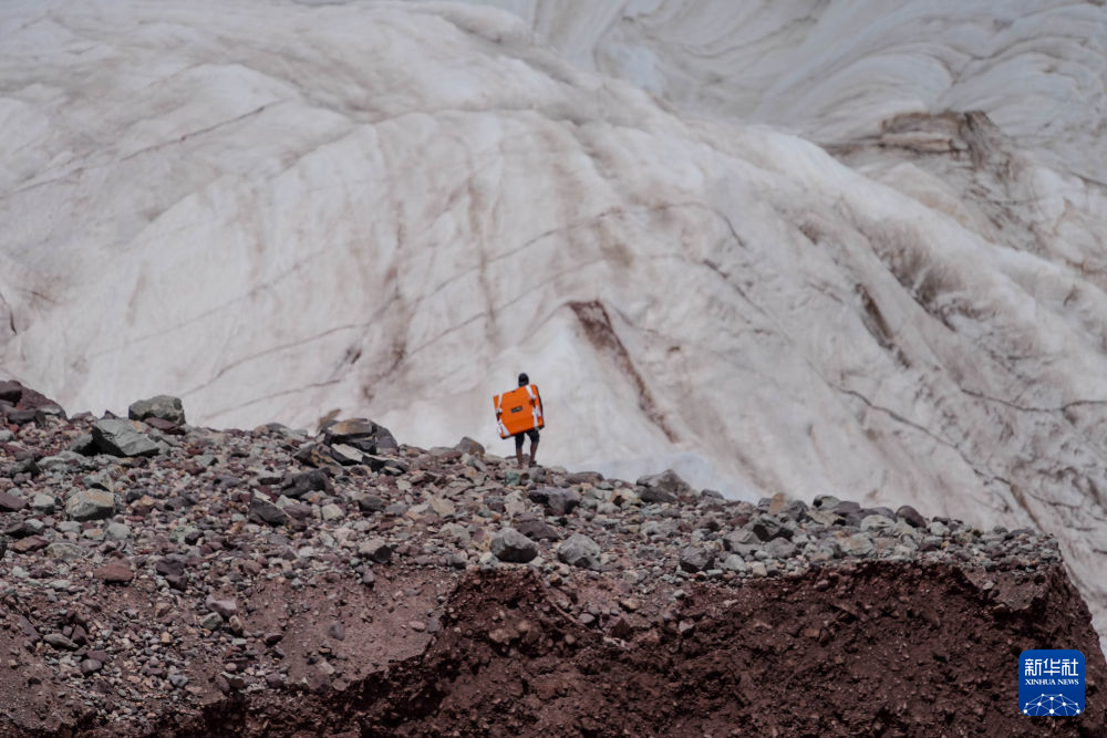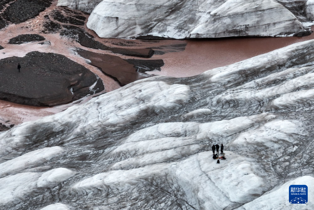 7月25日,在冬克瑪底冰川,科考隊員在探測冰川(無人機照片)。新華社記者 伍志尊 攝