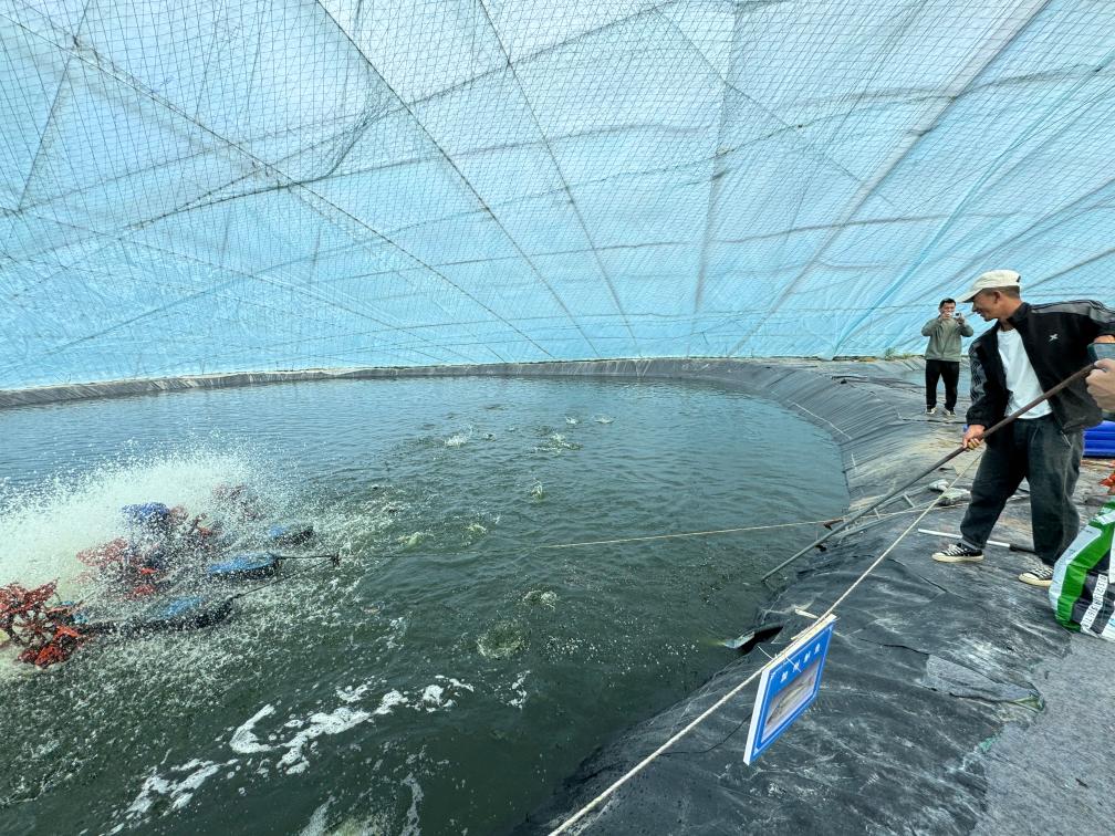 養殖基地的職工正在進行捕撈。新華社記者沈曉朦 攝
