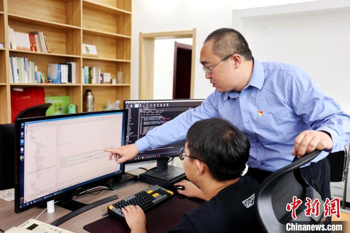 圖為蔡海寧(右)指導同事進行編程。張添福 攝