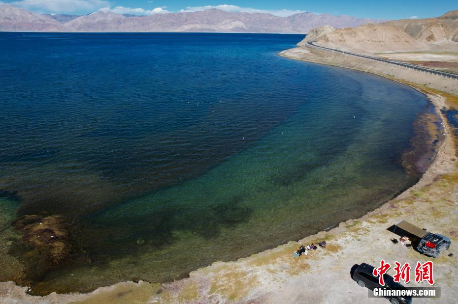 10月4日,游客在班公湖邊休閑露營。“十一”國慶假期,不少游客來到西藏日土縣班公湖游玩。(無人機照片)