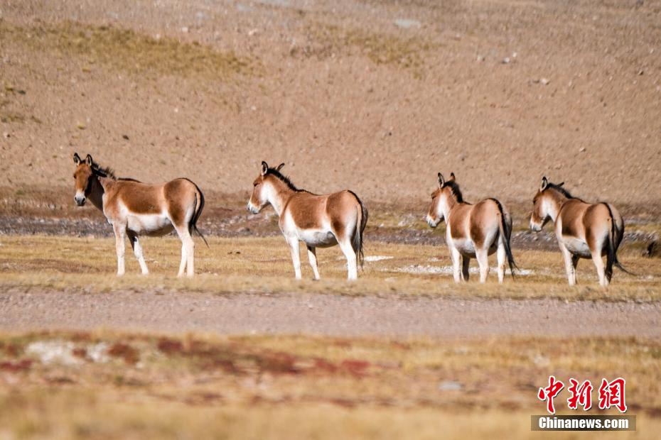 西藏羌塘草原位于昆侖山脈、唐古拉山脈和岡底斯山脈之間,是野生動植物的天堂。近日,中新社記者探訪西藏羌塘草原腹地那曲市雙湖縣,看到當地藏羚羊、藏野驢、藏原羚等野生動物成群覓食,悠然自得。圖為10月3日,羌塘草原上的一群藏野驢悠閑覓食。