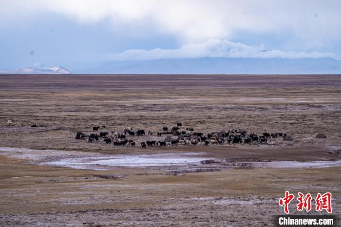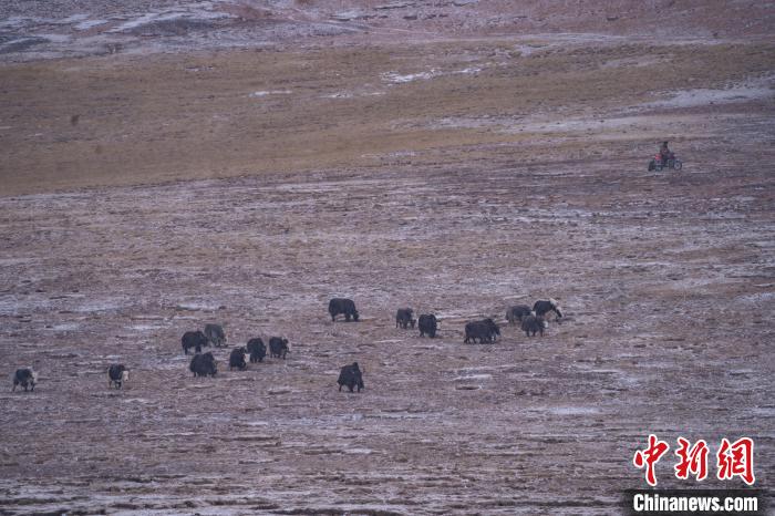 10月23日,西藏自治區那曲市安多縣多瑪鄉牧民在雪中放牧。當日,一場雪將藏北草原裝扮得如詩如畫。牧民們在這銀裝素裹的天地間,開始了雪中放牧的生活。牛羊在雪地中悠閑覓食,牧民駕駛著摩托車,在雪中放牧,形成了一幅動人的風景畫。圖為牦牛在草原上覓食。中新社記者 貢嘎來松 攝