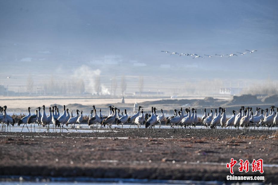 11月27日晨,西藏自治區拉薩市林周縣黑頸鶴保護區內,大量越冬的黑頸鶴在虎頭山水庫覓食、嬉戲。林周縣位于拉薩河上游及澎波河流域,平均海拔約4200米,是黑頸鶴的主要越冬地之一。