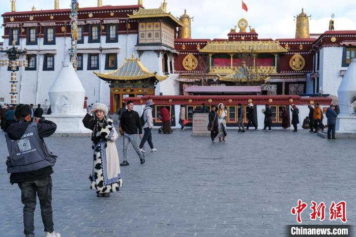 11月28日下午,游客在拉薩大昭寺廣場拍攝服裝寫真。 中新社記者 江飛波 攝