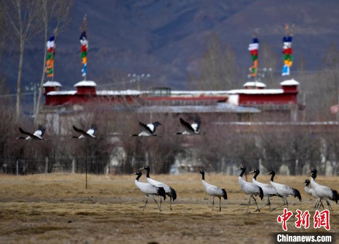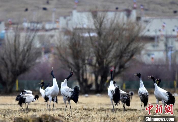 黑頸鶴是全球十五種鶴類中唯一在高原地區繁殖和越冬的鶴類,被譽為“高原神鳥”,屬中國國家一級保護動物。每年10月中下旬左右,黑頸鶴陸續飛抵雅魯藏布江中游河谷等地越冬。圖為3月8日,西藏拉薩林周縣黑頸鶴保護區,黑頸鶴在田間覓食、嬉戲。中新社記者 李林 攝