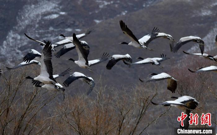 黑頸鶴是全球十五種鶴類中唯一在高原地區繁殖和越冬的鶴類,被譽為“高原神鳥”,屬中國國家一級保護動物。每年10月中下旬左右,黑頸鶴陸續飛抵雅魯藏布江中游河谷等地越冬。圖為3月8日,棲息在西藏拉薩林周縣的黑頸鶴。中新社記者 李林 攝