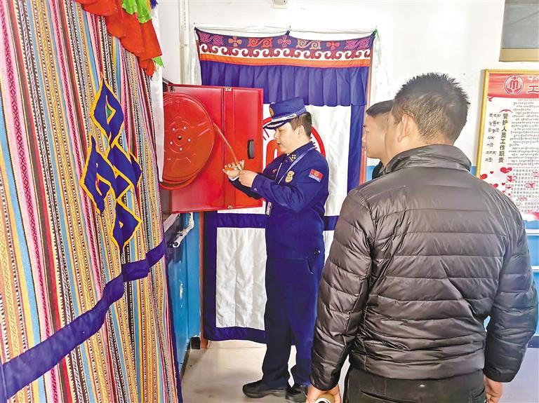 林芝市工布江達縣消防救援大隊宣傳人員檢查養老機構的消防設施設備。通訊員 才旺多吉 攝