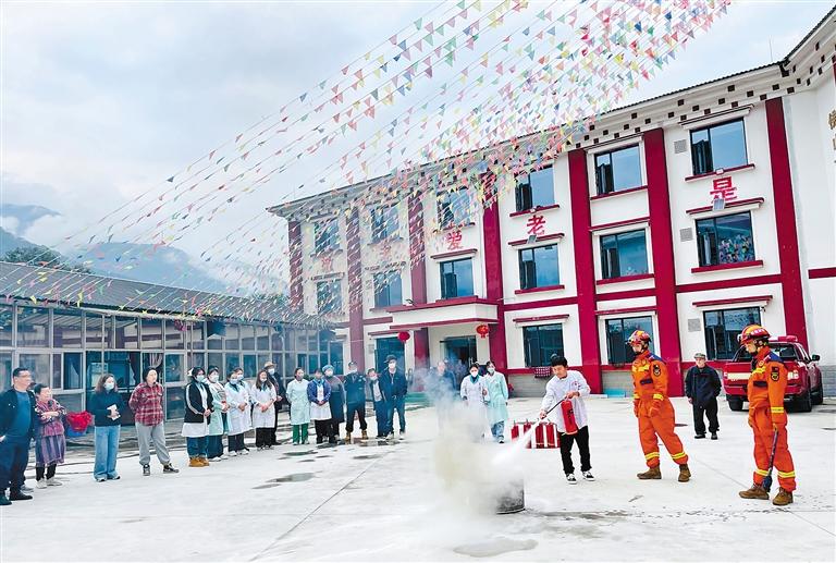 林芝市墨脫縣消防救援大隊宣傳人員走進養老機構,現場演示滅火器的使用方法,并進行實操演練。通訊員 才旺多吉 攝