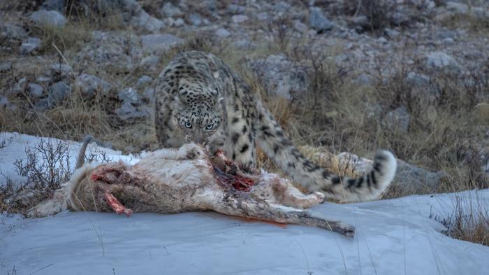 青海省玉樹藏族自治州境內,一只雪豹在捕食。 玉樹藏族自治州官方供圖