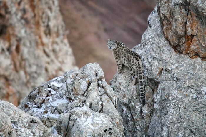 青海省玉樹藏族自治州境內,一只雪豹在山崖間眺望。 玉樹藏族自治州官方供圖