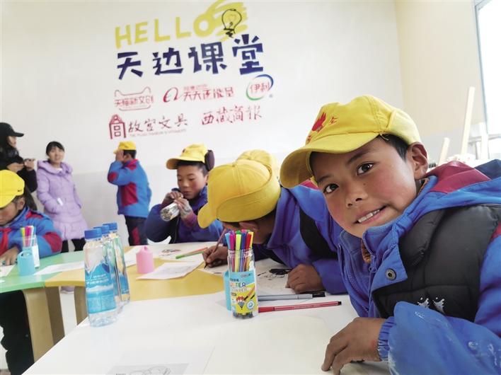 2019年8月,當孩子們迎來新的一學期,天貓、人民日報和故宮聯合宣布,故宮文具上線天貓。為了給孩子們一份特別的禮物,天貓新文創、阿里巴巴天天正能量、伊利、故宮文具、西藏商報聯合發起“天邊課堂”公益項目,為西藏一所村小改造一間海拔最高的“天邊課堂”教室,為孩子們送上故宮文具,設計形式多樣的美育課程,助力鄉村孩子在開學伊始揚帆起航,開啟新學期新體驗。