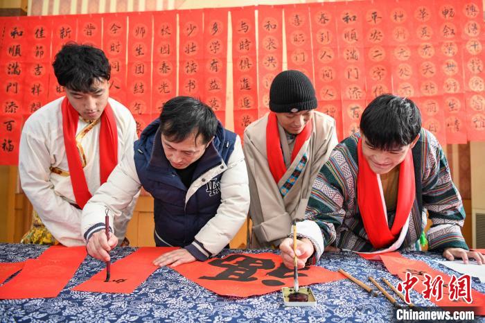 寫春聯、掛燈籠、做湯圓……在綿綿的藏歌聲中,留校西藏學生向陪伴他們連續度過了兩年春節的“代表媽媽”們敬獻了潔白哈達,而“代表媽媽”則為她們的“西藏孩子”們圍上了紅色圍巾,互相傳遞著美好祝愿。