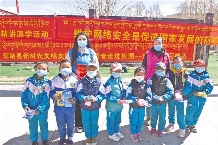 志愿者向瓊結鎮(zhèn)小學學生發(fā)放學習用具,開展“綠書簽”活動。記者 洛桑 次旺 攝