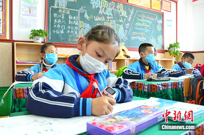 4月15日,玉樹市第三完全小學的學生在課堂上做筆記。中新社記者 魯丹陽 攝