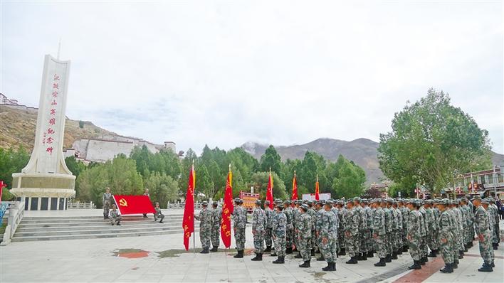 圖為駐藏某汽車團野外駐訓分隊在江孜宗山英雄紀念碑前開展主題黨課活動。加央群決 李豪 攝