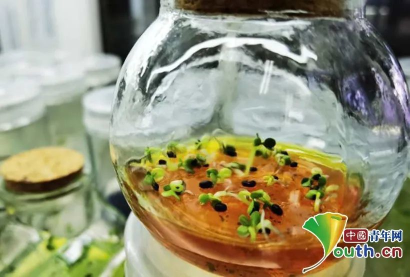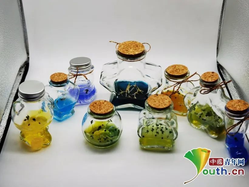 在形態各異的玻璃罐里,裝著色彩斑斕的培養基,上面孕育著排列工整的幼苗,十分精致。記者了解到,這些看似相同的植物苗,實際上包含了油菜、小麥以及大豆三個不同品種,更是此專業老師的研究成果。其中,油菜品種是該專業老師郭世星用于景觀美化的育成品種紫葉油菜,小麥是專業負責人蒲至恩新育成的紫色和藍色品種,大豆是該專業老師武曉玲的育成品種,具有耐蔭特點。“我們想送給新生一份有意義的見面禮,增加大家對這個專業的歸屬感。”蒲至恩說。