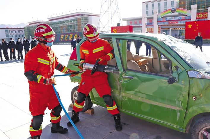 阿里地區消防員在演示汽車破拆救援。圖片由西藏自治區消防救援總隊提供