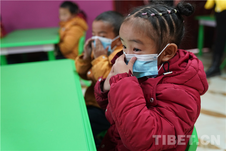 圖為那曲比如縣第一幼兒園孩子們學習戴口罩 攝影:王淑