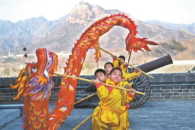 北京市密云區(qū)古北口鎮(zhèn)中心小學(xué)結(jié)合戍邊文化、地域文化,成立“舞龍”社團(tuán)。喜愛傳統(tǒng)舞龍文化的學(xué)生登上長(zhǎng)城,舞出“堅(jiān)毅”精神,舞出時(shí)代風(fēng)采,舞出民族自豪。樊世剛 攝