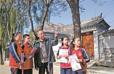 長(zhǎng)城腳下美麗的河西村為什么會(huì)有137個(gè)姓氏?走在村中古樸的小路上,聆聽老支書張玉山的講述,古北口鎮(zhèn)中心小學(xué)學(xué)生探尋河西村多民族、多姓氏融合的“百姓村”成因。樊世剛 攝