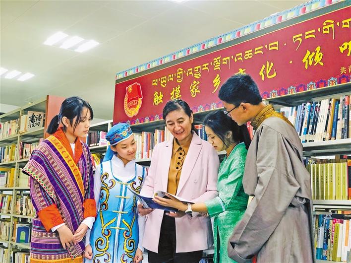 共青團西藏自治區委員會副書記格桑卓瑪(中),在武漢西藏中學設立的“觸摸家鄉變化·傾聽黨的聲音”主題書刊欄處向學生們介紹相關書籍。