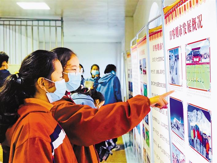 宣講組一行通過圖片和文字資料,向內地西藏班的學子們展示了西藏翻天覆地的變化及各項事業取得的成就。圖為內地西藏班學生觀看圖片和文字展。