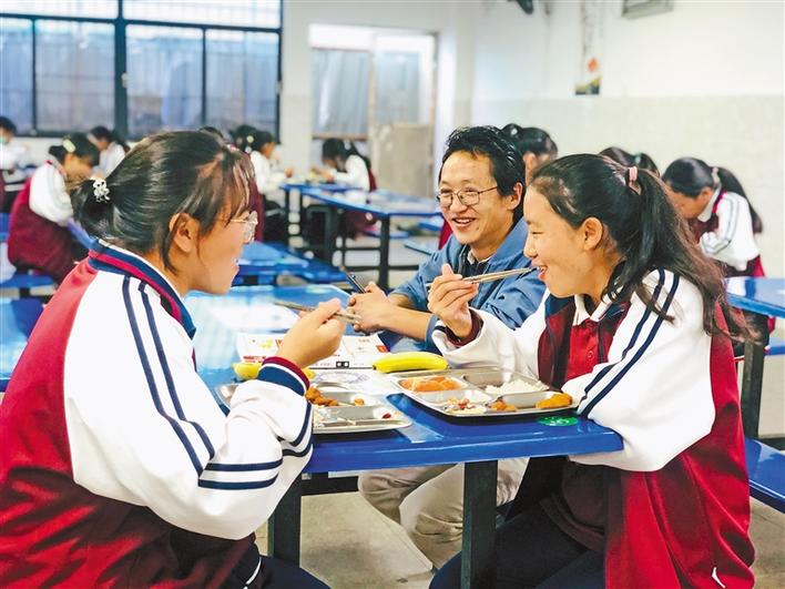 西藏青年報社副社長洛桑頓珠(右二)在珠海四中學校食堂與內地西藏班學生進行交談。