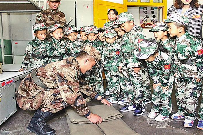 圖為日喀則軍分區某團官兵為小學生們演示疊軍被。