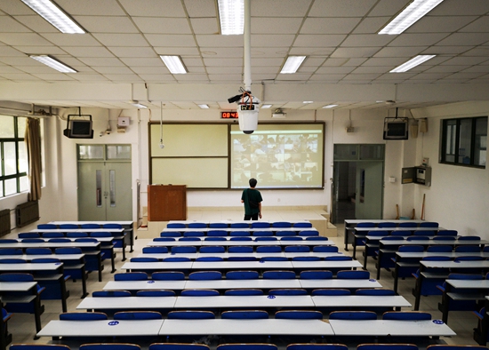 2020年7月14日,山東省青島市,一名教師在山東科技大學一間空曠的教室里通過屏幕進行“云”監考。受疫情影響,該校采用線上的方式進行期末考試。孫德波/攝