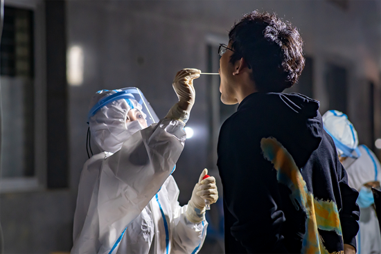 2020年10月14日,山東省青島市,中國石油大學(華東),醫護人員對學生進行核酸檢測。當日,青島新增一例新冠肺炎本地確診病例。田瑜亮/攝