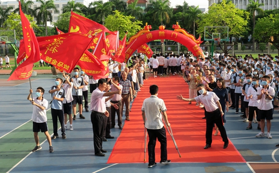 2020年7月6日,廣西南寧市第三十三中學,一名拄著拐杖的高考生在老師同學的鼓勵下走向“得勝門”。當日,該校舉辦高考“出征”儀式,祝福學生高考取得勝利。區明慶/攝