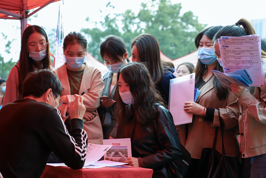 2020年10月24日,湖北省武漢市,華中師范大學武漢部屬高校聯合招聘會上,畢業生與用人單位交流。唐麗香/攝