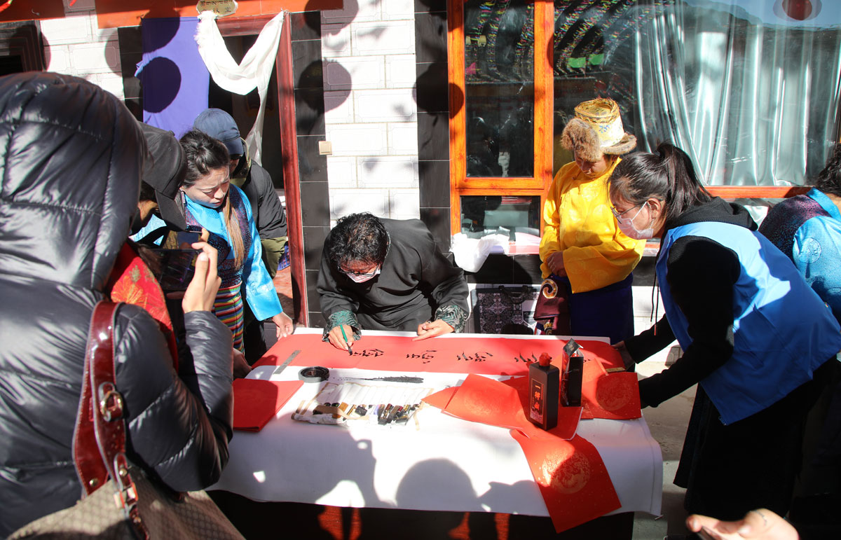 西藏自治區(qū)書(shū)協(xié)副主席、拉薩市書(shū)協(xié)副主席南杰旺扎說(shuō):“值此新春佳節(jié)和藏歷新年來(lái)臨之際,拉薩市文聯(lián)書(shū)法家協(xié)會(huì)組織了三位老師來(lái)到吉蘇村開(kāi)展送書(shū)法活動(dòng),一是宣傳黨的好政策,二是雙節(jié)臨近給基層干部群眾送上節(jié)日的祝福。”
