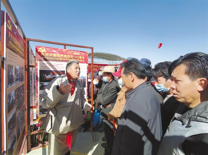 圖為在桑珠孜區甲措雄鄉文化廣場,宣講員結合展板圖文內容開展黨史學習教育宣講。汪純 攝