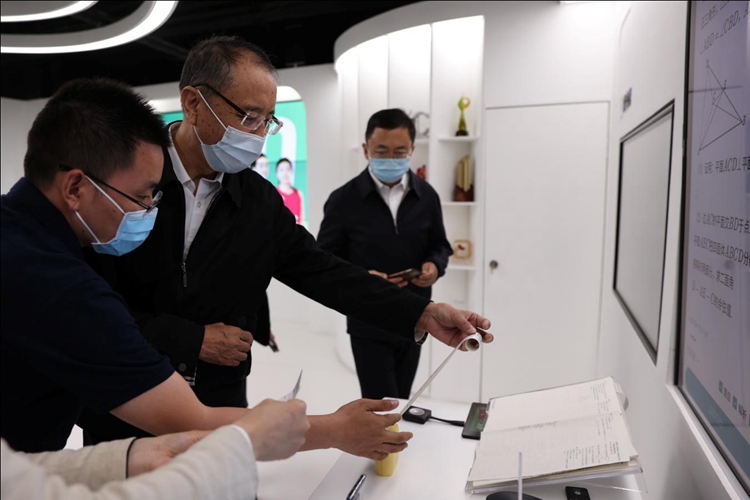 圖為作業幫CEO侯建彬向中央統戰部斯塔同志介紹相關產品