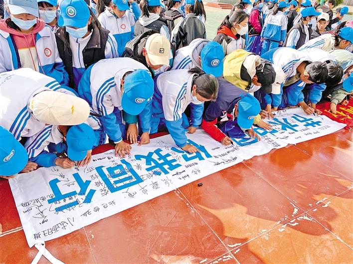 圖為學生們在條幅上簽名,許下節水愛水的承諾。錢加典 王珊 攝