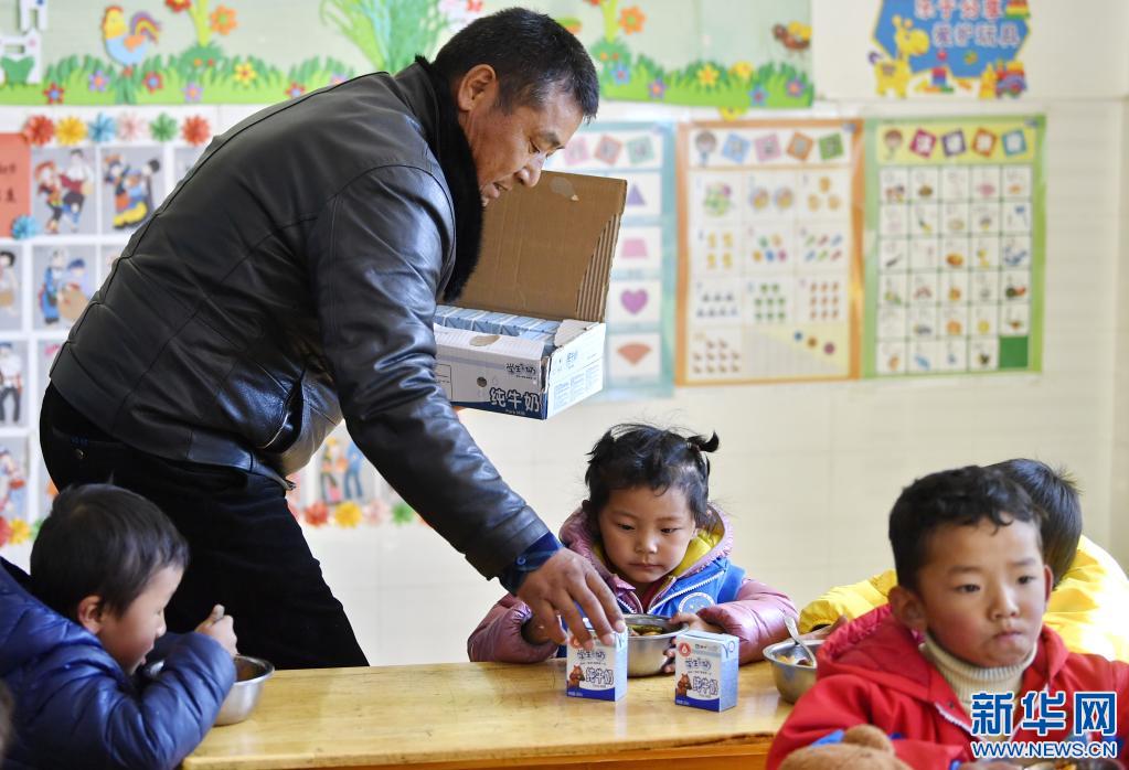 山南市貢嘎縣吉雄鎮(zhèn)紅星社區(qū)雙語(yǔ)幼兒園的老師正在為孩子們分發(fā)牛奶(2020年11月25日攝)。 新華社記者 張汝鋒 攝