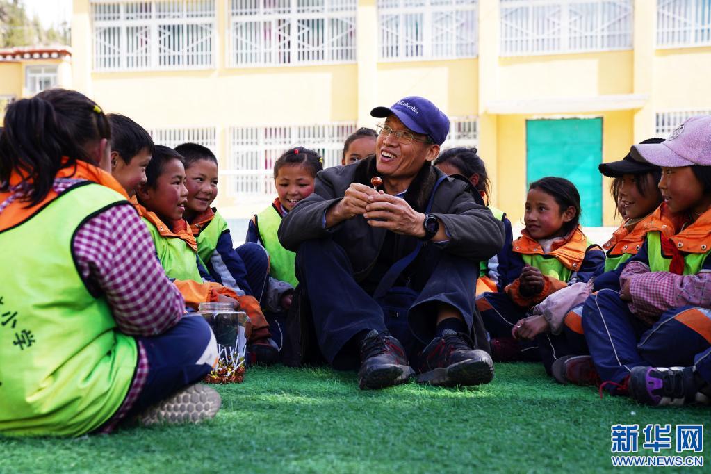 5月1日,在西藏昌都市類烏齊縣伊日鄉小學,李純民(中)和學生們交流。新華社記者 黃臻 攝