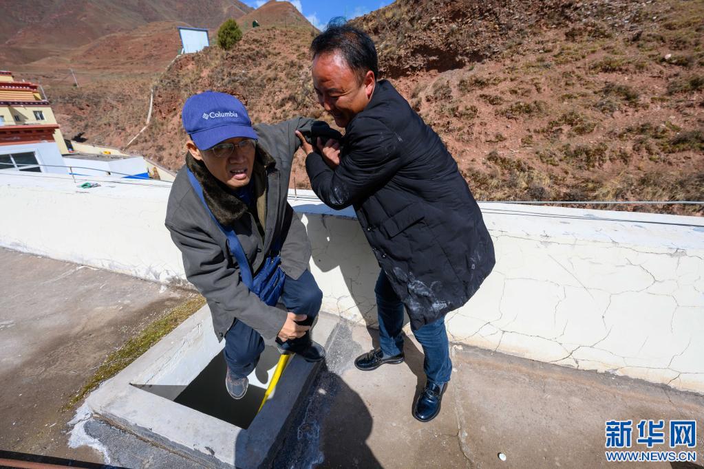 5月3日,在西藏昌都市類烏齊縣吉多鄉小學,李純民(左)在吉多鄉小學校長鄧增群培的幫助下,爬上學生食堂樓頂,監督太陽能熱水器的維修工作。新華社記者 劉金海 攝
