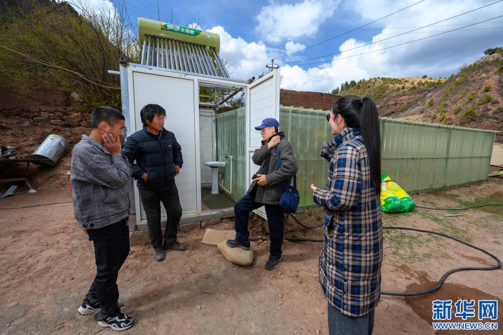 5月2日,李純民趕到西藏昌都市類烏齊縣濱達鄉濱達村,為當地村民向巴巴登協調太陽能熱水器的安裝調試工作。這是李純民(右二)通過濱達鄉小學老師索朗卓瑪(右一)作藏語翻譯,就熱水淋浴室與水沖廁整體改造計劃給向巴巴登(左二)提出建議。新華社記者 劉金海 攝