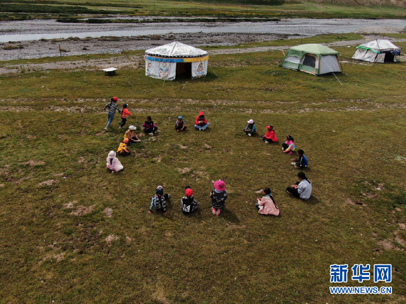 8月2日,在青海省果洛藏族自治州瑪沁縣下大武鄉年扎村的“育苗加油站”,孩子們坐在草地上玩游戲(無人機照片)。新華社記者 李占軼 攝