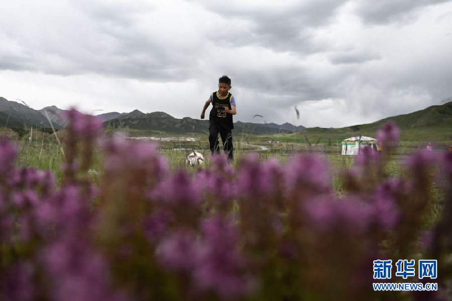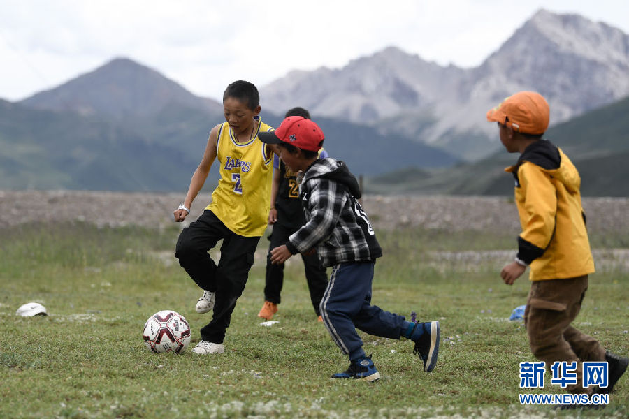 8月2日,在青海省果洛藏族自治州瑪沁縣下大武鄉年扎村的“育苗加油站”,普毛扎西在踢球。新華社記者 張龍 攝