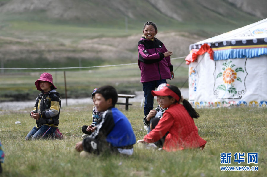 8月2日,在青海省果洛藏族自治州瑪沁縣下大武鄉年扎村的“育苗加油站”,孩子們在一起玩耍。新華社記者 張龍 攝