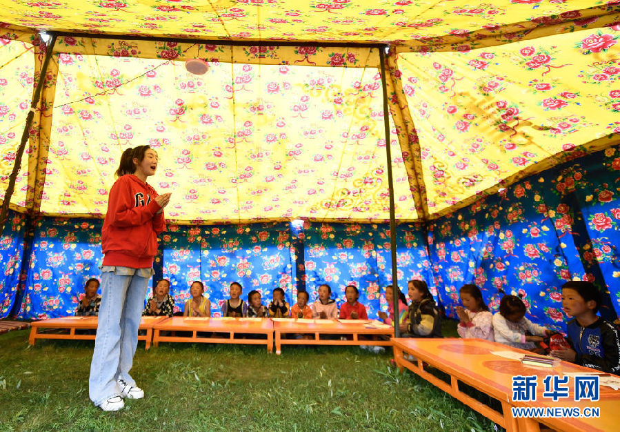 8月2日,在青海省果洛藏族自治州瑪沁縣下大武鄉年扎村“育苗加油站”的帳篷里,大學生鬧日卓瑪在教孩子們唱歌。新華社記者 張龍 攝