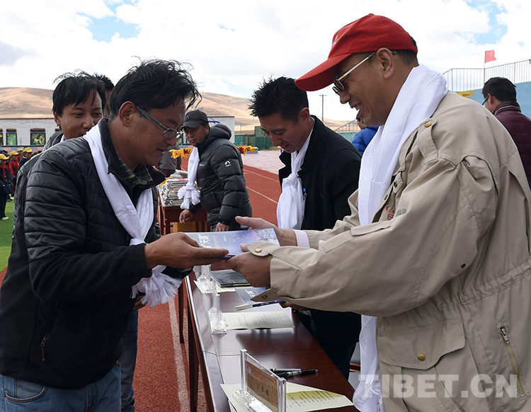 這是西藏那曲地區那曲縣(現那曲市色尼區)羅瑪鎮中心小學校長拉巴格桑(右)代表學校向北京鐵路客運段代表王博軒(左)贈送錦旗(唐召明2014年5月29日攝)