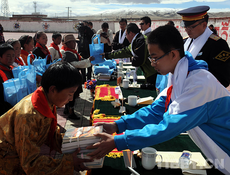 在短短的半個月時間里,北京鐵路局客運段所捐贈的兒童課外讀物和音像制品就達到了3000多件,加上新華社北京分社、民進朝陽區委、北京府學小學、北京羊坊店第五小學及眾多愛心人士等所捐贈的愛心圖書與文具,共有5000多件,所捐圖書均為藏漢文的小學生課外讀物。