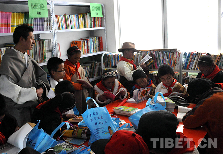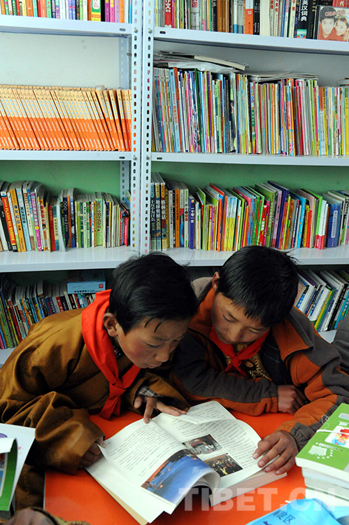 這是西藏那曲地區那曲縣(現那曲市色尼區)羅瑪鎮中心小學學生在新建的“愛心書屋”快樂地讀書(唐召明2014年5月29日攝)