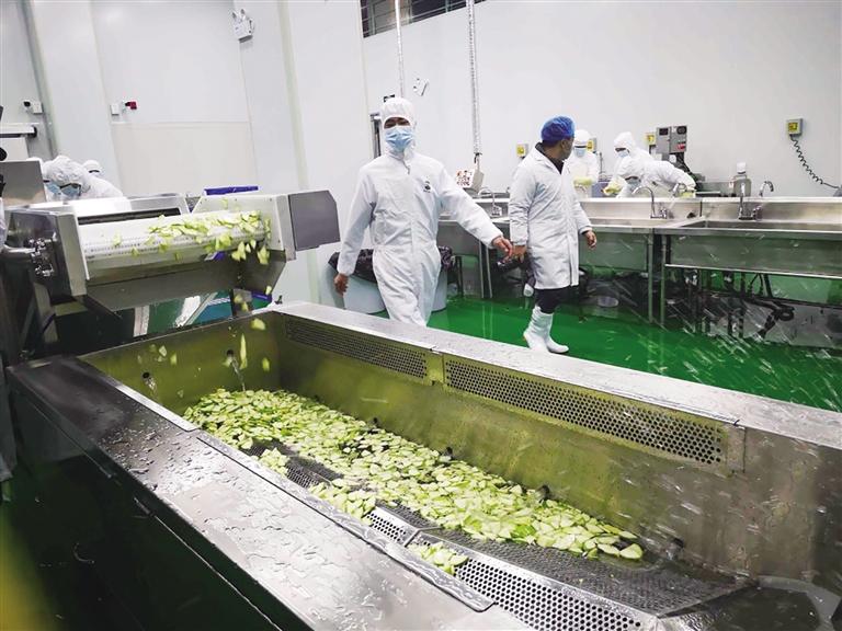 隨后,記者來到了素菜初加工車間,這里有很多設備,洗凈的一筐青筍條通過其中一個小設備后,兩分鐘全部變成了青筍丁,洗凈的菜瓜通過一條切片的生產線后立即變成了小的塊狀,經過保食安專業食品凈化工業機后,直接回收到盛菜的框里。在葷菜初加工車間,工作人員把雞蛋放入水池中消毒清洗,將洗凈的雞脯肉放入切丁機中進行分切,一兩分鐘雞脯肉就變成了肉丁。