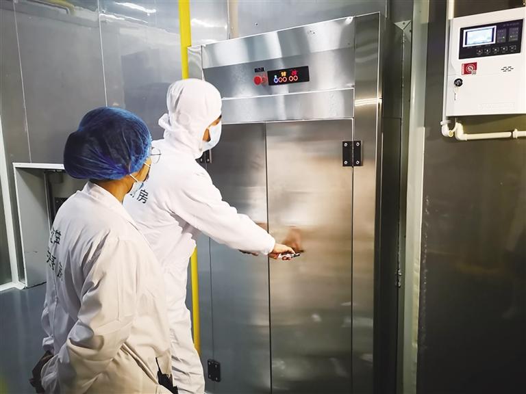 通過員工通道,在該廚房生產廠長甘文忠的指導下,記者穿上了白色工作服、戴上食品安全帽,換上高筒膠鞋,洗手消毒、測量體溫、隨身攜帶的手機、首飾全部摘掉后,通過腳踏池進入生產加工車間。